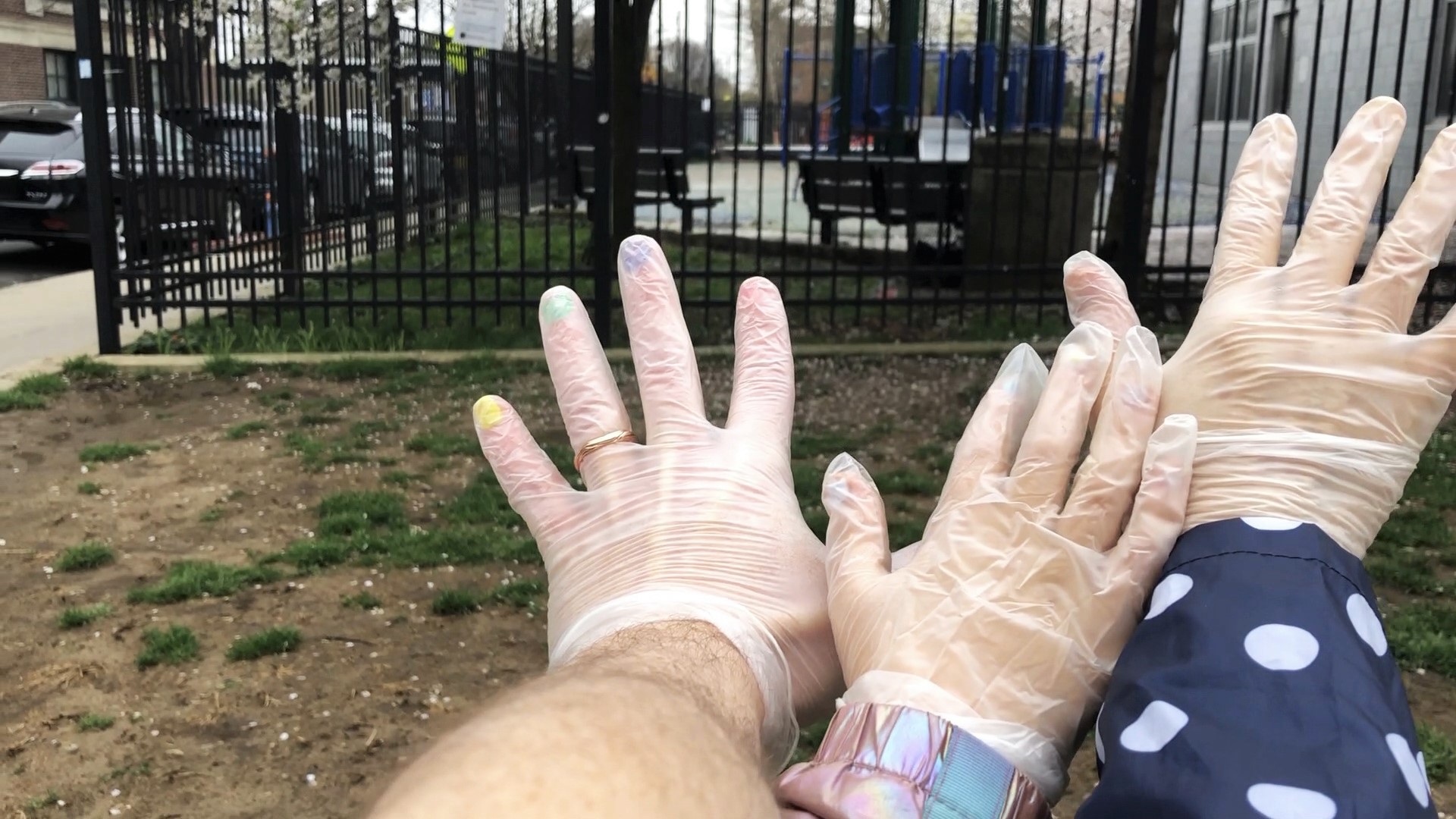 These are hands of David Brick, Zephyr Saffron Matsushima Brick, and Maiko Matsushima. It’s a still photo from a shot that didn’t make it to the video I was working on in March-April called “Dreaming Space” (https://vimeo.com/407349254). For it, I asked Philly folks to write down a dream about the kind of world they wanted to live in, use it as a prompt to create a short movement phrase, film it, and send it to me. The image was striking. Maybe it was the fun nail polish peeking through the gloves. Or the fact that I didn’t notice them wearing gloves in the wider movement shots. Or maybe it was the radical capacity and courage of our imagination to dream about the new world while wearing disposable gloves.