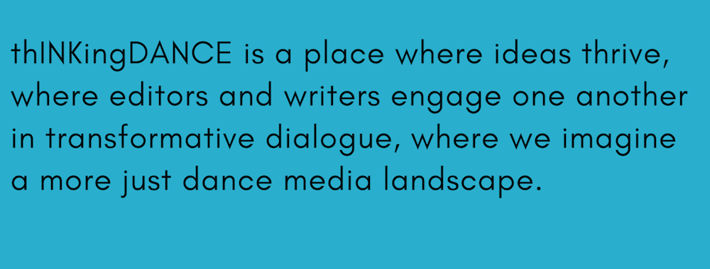 We pursue these goals by training together through peer-critique sessions, with guest educators, and a two-tiered editing process. thINKingDANCE is a place where ideas thrive, where editors and writers engage one another in transformative dialogue, and where we imagine a more just dance media landscape.
