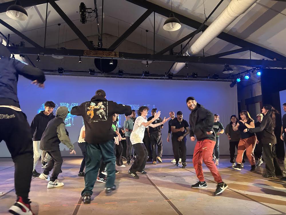 Image description: large group of dancers in sweatpants, hoodies, and sneakers jamming together on stage after the cypher