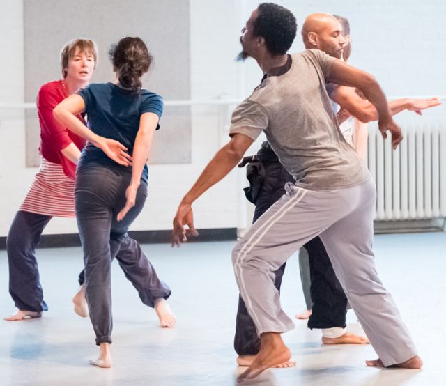 Behind them, Sarah Gamblin is immersed in a solitary world, appearing far away in the wide, bright studio. She refines angular arms and spiraling torso for close to an hour, her increasing sweatiness evidence of passing time. To the right, Michelle Boulé, Angie Hauser, and Bronwen MacArthur are trio-ing, calibrating seemingly independent phrases to carefully intersect. It’s mostly quiet, save the irregular sounds of sliding feet, clothes and skin brushing the floor, and the occasional soft discussion bubbling up, sometimes erupting into laughter before settling down into quiet once more.